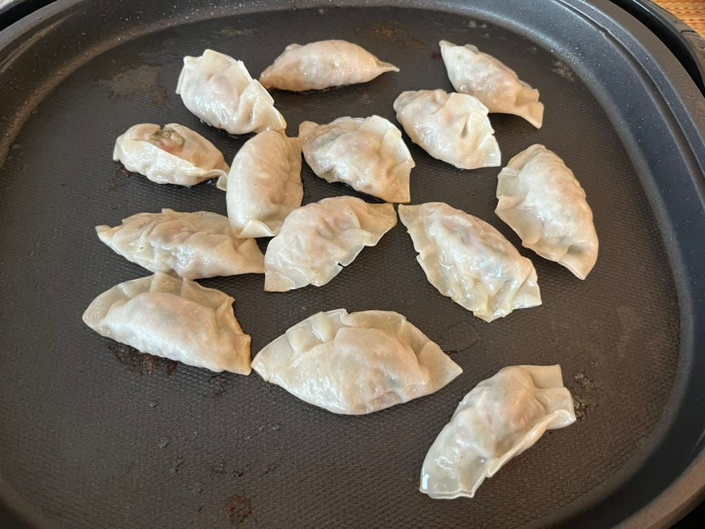 One of the first things we made on the griddle was gyoza (potstickers). When you try to make a lot of gyoza on the stove, you end up going through many batches because you’re limited by the size of your pan. On the griddle, you can easily cook dozens of dumplings at once.